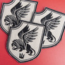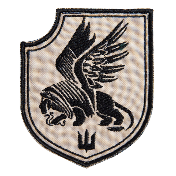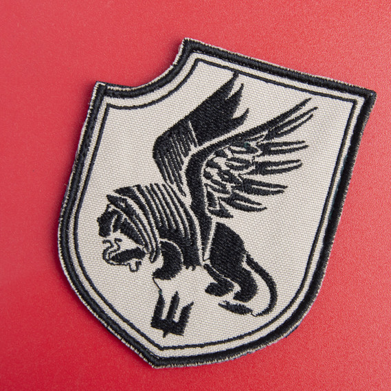Fabric chevron, which symbolizes belonging to the defense forces of Ukraine. It is made in the shape of a rectangle with a motivational drawing, the coat of arms of Ukraine and an inscription. The main color of the chevron is black. The edges are decorated with a black border. Embroidered on the chevron: