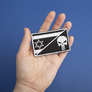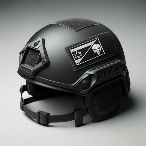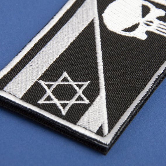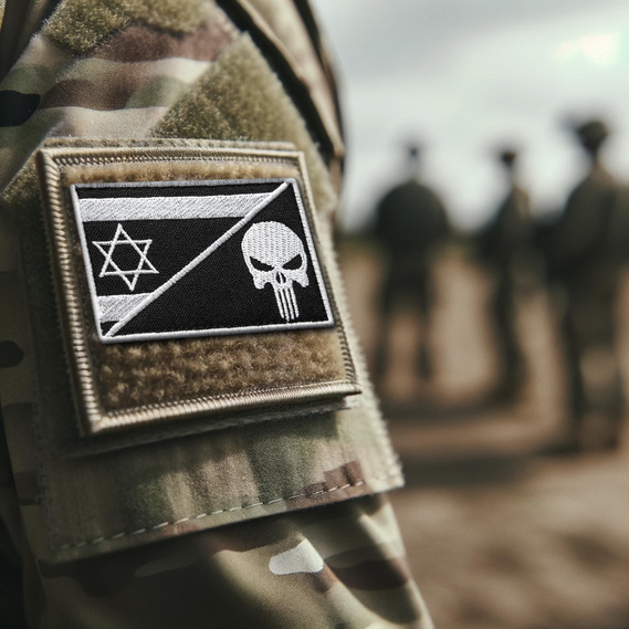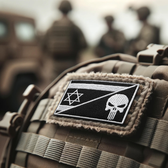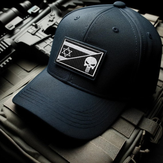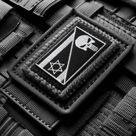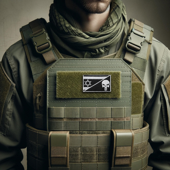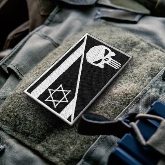 This Velcro patch set presents a unique fusion of two symbols – the flag of Israel and the iconic American cinema character, the Punisher. These two rectangular patches serve as expressive elements of military symbolism. Their embroidery in white thread against a black base, along with a dense, stylish white border, gives them a chic appearance.