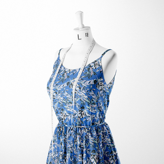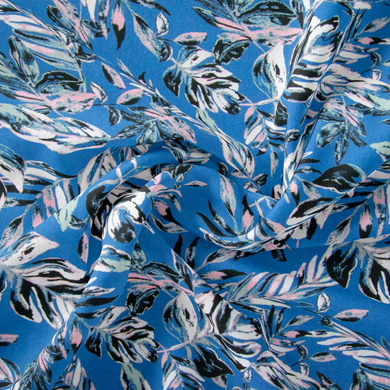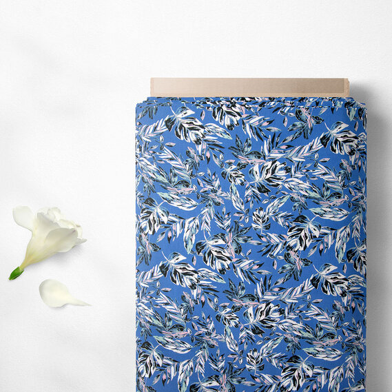 Ткань штапель твил принт, 140 см, 160 гр/м2, для платьев, блузок, юбок монстера темно блакитний