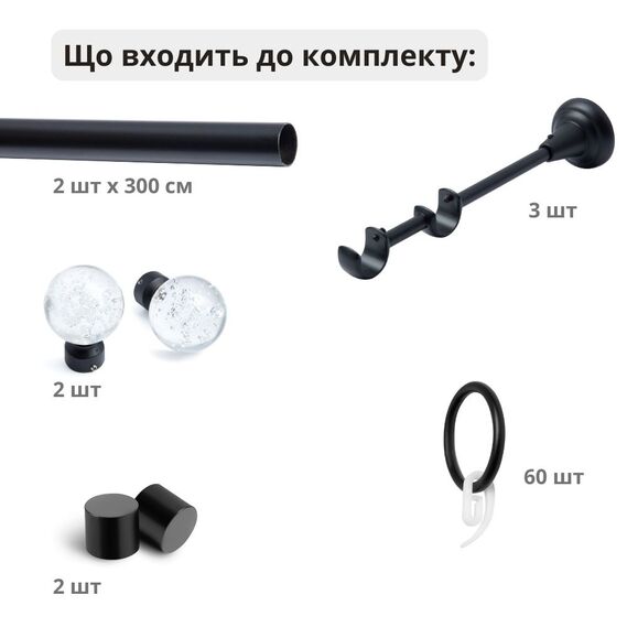 - Состав комплекта В комплект входить: штанга 300 см - 2 шт, кронштейн - 3 шт, наконечник Шар - 2 шт, заглушка - 2 шт, кільце - 60 шт, гачок сігма - 60 шт