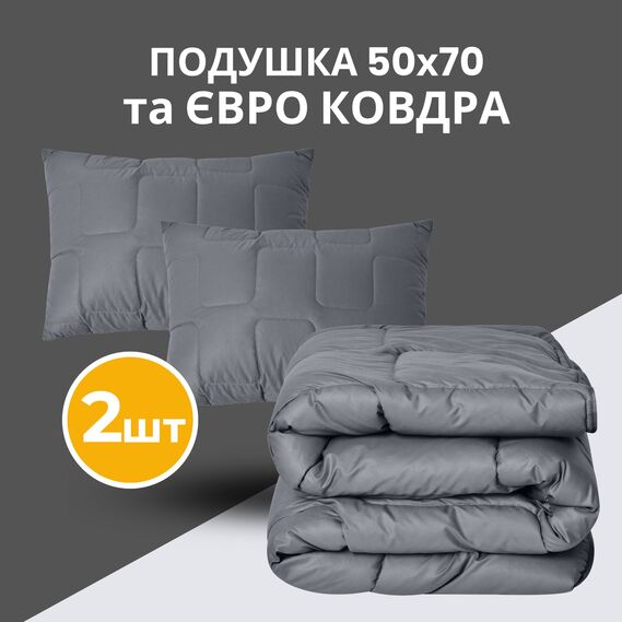Набір євро ManMaker IDEIA ковдра 200х220 та 2 шт подушка 50х70 сірий антиалергійний, штучний пух + маска для сну в коробці
